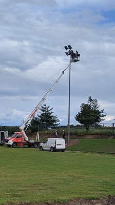 Auf den Bildern erkennt man die Grabenarbeiten zur Erneuerung der Verkabelung, die Geländeneugestaltung auf der südlichen Seite des Sportplatzes, sowie die Mitarbeiter der Fa. Hudson beim Wechsel der Beleuchtungsanlge bzw. wie die fertig montierte Beleuchtung aussieht.